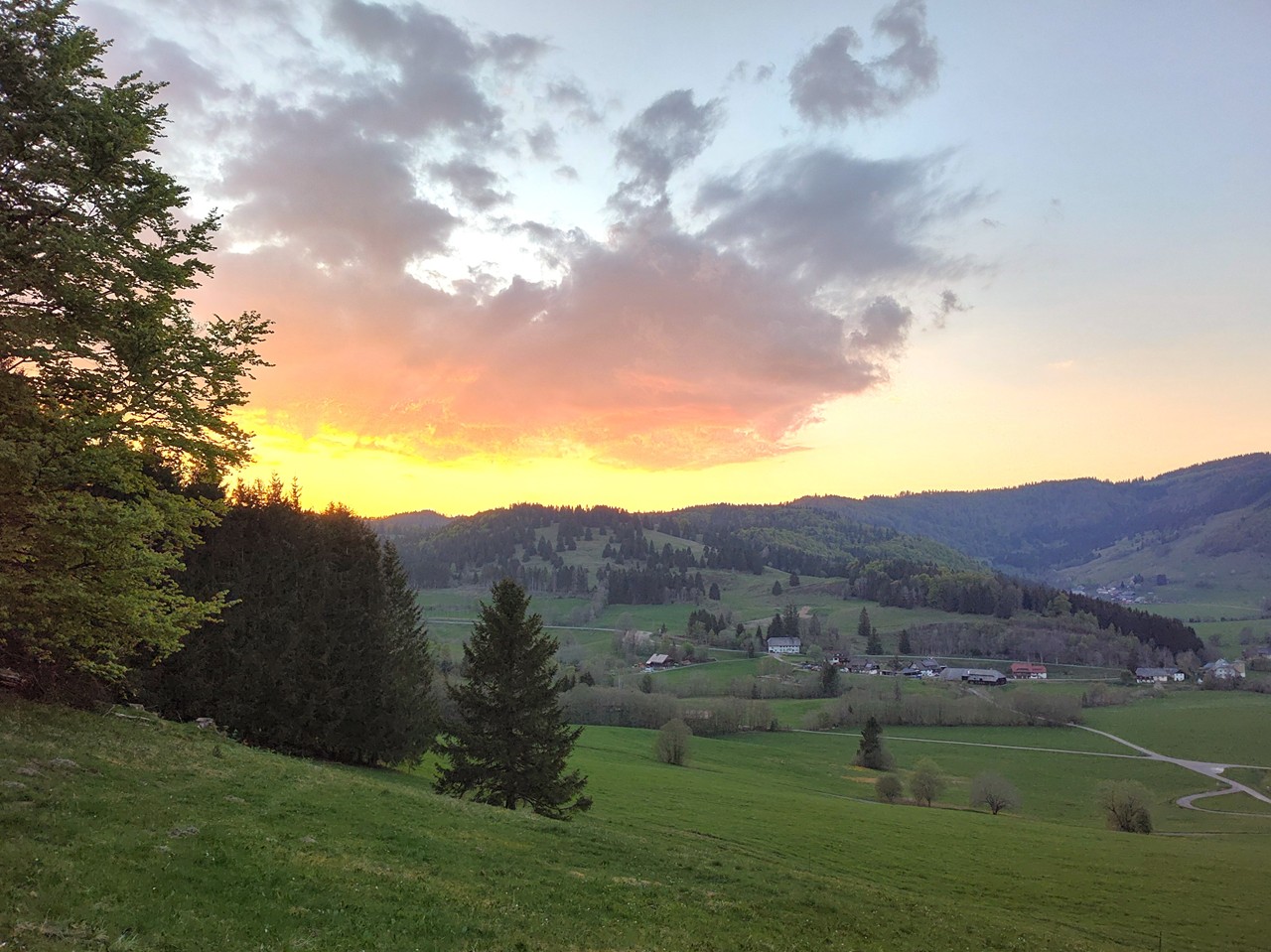 Weil wir heute schon genug gelaufen sind, drehe ich mit Doxi am Abend nur eine kleine Runde hinauf in den Bergwald, wo die Skipisten beginnen. Die untergehende Sonne leuchtet durch den Wald und bemalt die Unterseite der Wolken in warmen Farben. Schön sieht das aus.