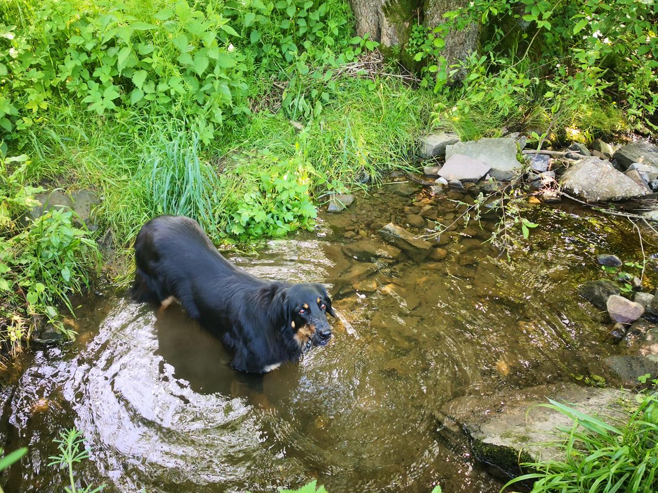 Im Vorfeld hatte ich etwas Bedenken, ob das gut funktionieren würde, denn es war klar, dass ich Doxi immer wieder für einige Stunden im Wohnmobil würde zurücklassen müssen. Doch ich habe einen wunderbaren Schattenplatz unter Bäumen erwischt, wodurch es im Wohnmobil nicht zu heiß wurde.Und das Salvaticum, der „Länderbaumpark“, gleich neben dem Schulungszentrum, erwies sich als ideal, um zwischendurch mal schnell für eine halbe Stunde mit Doxi rauszugehen. Großzügige Wiesenflächen zum Stöckchenwerfen, kühlende Bachläufe und lauschige Rastplätze unter uralten Bäumen – alles vorhanden, was meinen Hund glücklich macht.