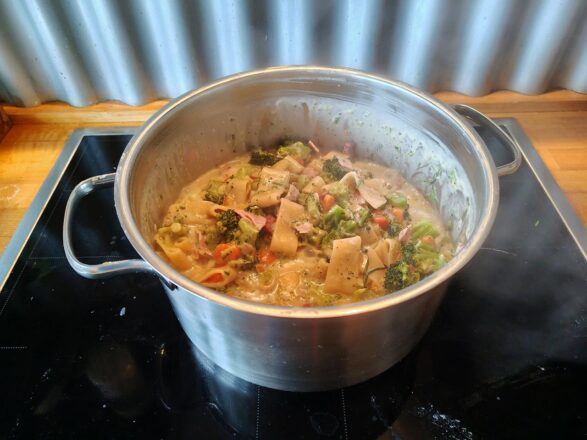 Die Möhren, Zwiebeln und den Brokkoli zunächst in kleine Stücke schneiden. Möhren und Zwiebeln anschließend mit Öl im Topf andünsten. Dann kommen die rohen Nudeln und 1 Liter bereits erhitztes Nudelwasser hinzu. Das Ganze zum Kochen bringen, zwei Esslöffel Brühpulver, sowie Salz und Pfeffer hinzugeben und abschmecken.