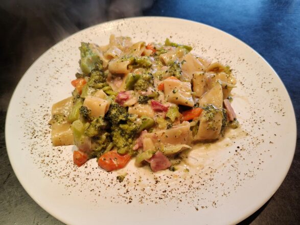 One-Pot-Pasta-Gerichte sind mir immer die liebsten. Frisch ausprobiert: ein Rezept mit Brokkoli, Möhren, Schinken und Kräuterfrischkäse als Geschmacksträger an der Sauce. Dazu verwendet habe ich Bronzo Calamari, große kurze Röhrennudeln, die etwas dicker sind und dadurch im Kern ein wenig bissfest bleiben können, sofern man das mag.