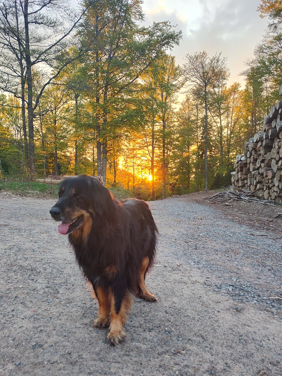 Weil wir heute schon genug gelaufen sind, drehe ich mit Doxi am Abend nur eine kleine Runde hinauf in den Bergwald, wo die Skipisten beginnen. Die untergehende Sonne leuchtet durch den Wald und bemalt die Unterseite der Wolken in warmen Farben. Schön sieht das aus.