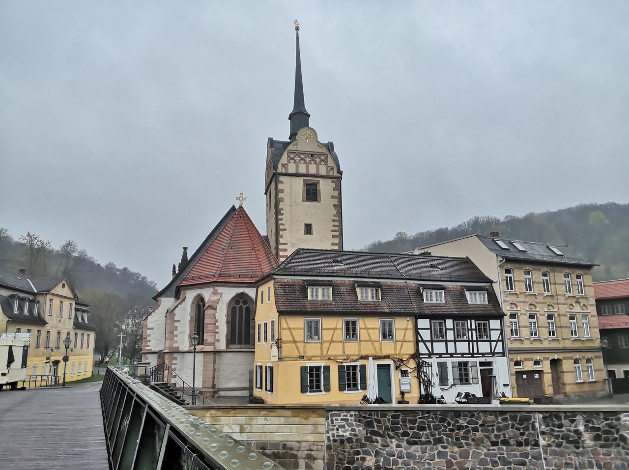 Am Abend bin ich dann von Erfurt wieder zurück in Richtung Osten, sogar ein wenig über die Saale hinaus, nach Gera an der weißen Elster.Mit 95.000 Einwohnern ist Gera die drittgrößte Stadt Thüringens. Doch am Ende eines komplett verregneten Wochenendes ist an diesem Sonntagabend kein Mensch mehr auf der Straße. Auch die wenigen geöffneten Restaurants – menschenleer.