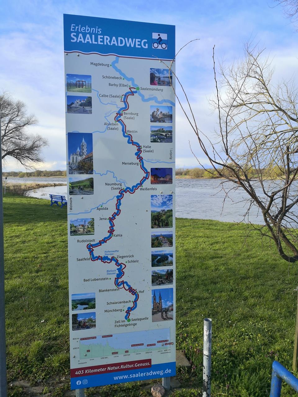 Die Saale hat bis hierhin mehr als 400 Kilometer von ihrer Quelle in Oberfranken zurückgelegt. Sie bildet – nach der Moldau – den zweitlängsten Nebenfluss der Elbe und entwässert ein Gebiet von 24 .000 km².