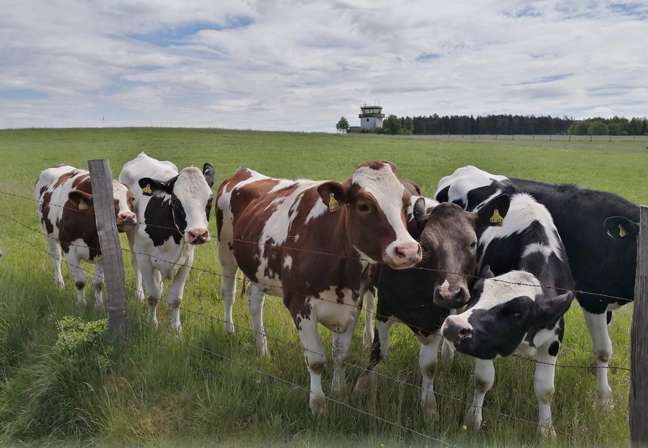 Neugierige Kühe vor dem Tower des Flughafens Attendorn-Finnentrop