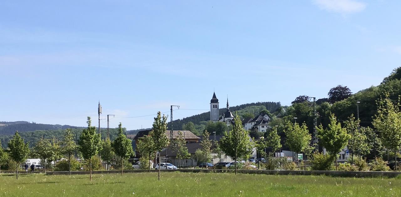 Blick vom Lennpark hinauf zur Kirche von Finentrop