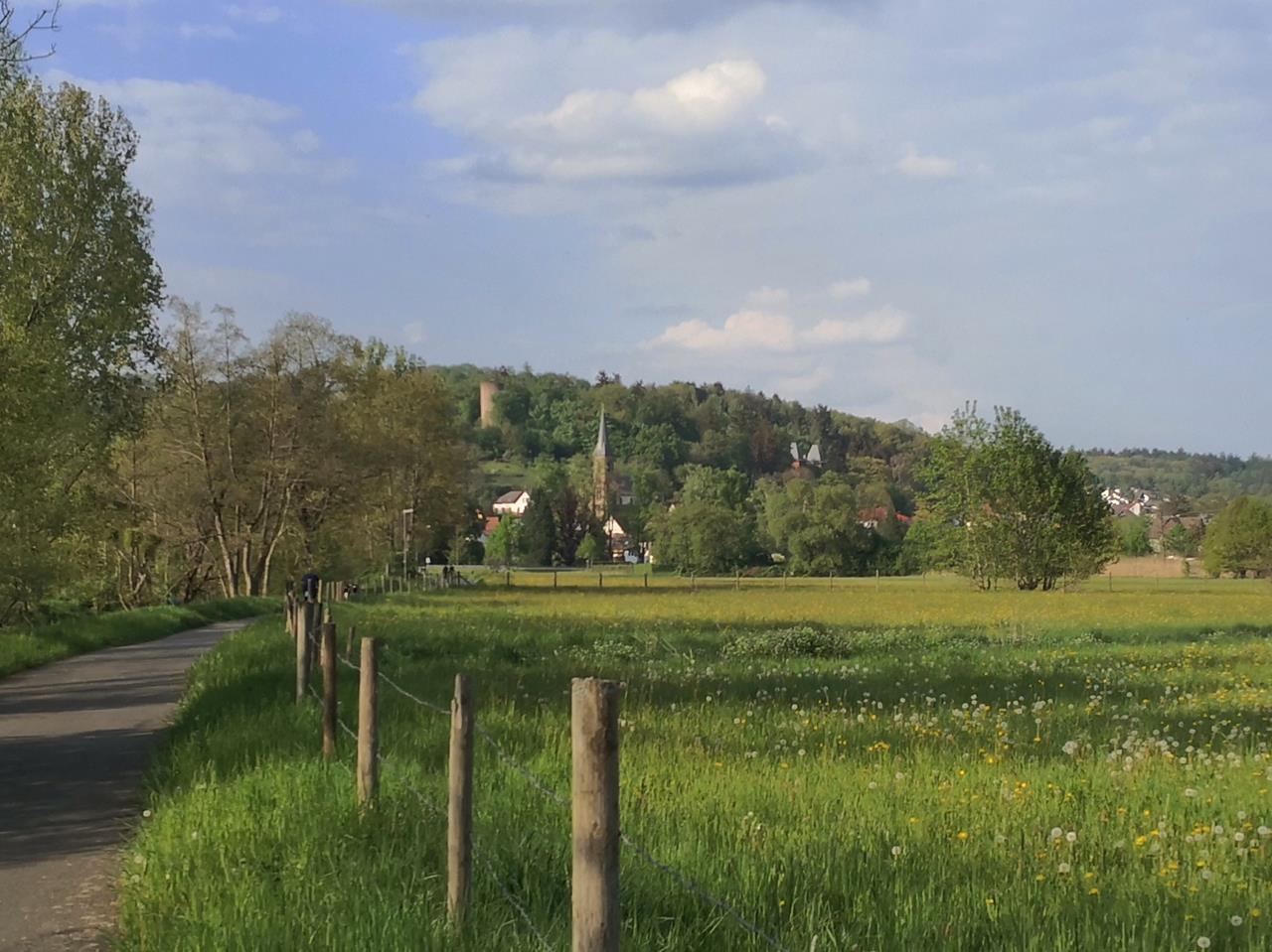Unsere Abendwanderung führt Doxi und mich von Bad Soden westlich der Salz nach Salmünster und anschließend über die Wiesen auf der Ostseite des Flusses wieder zurück.