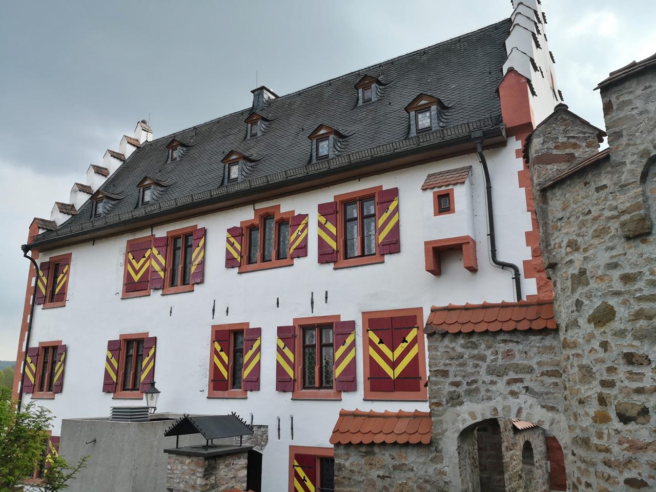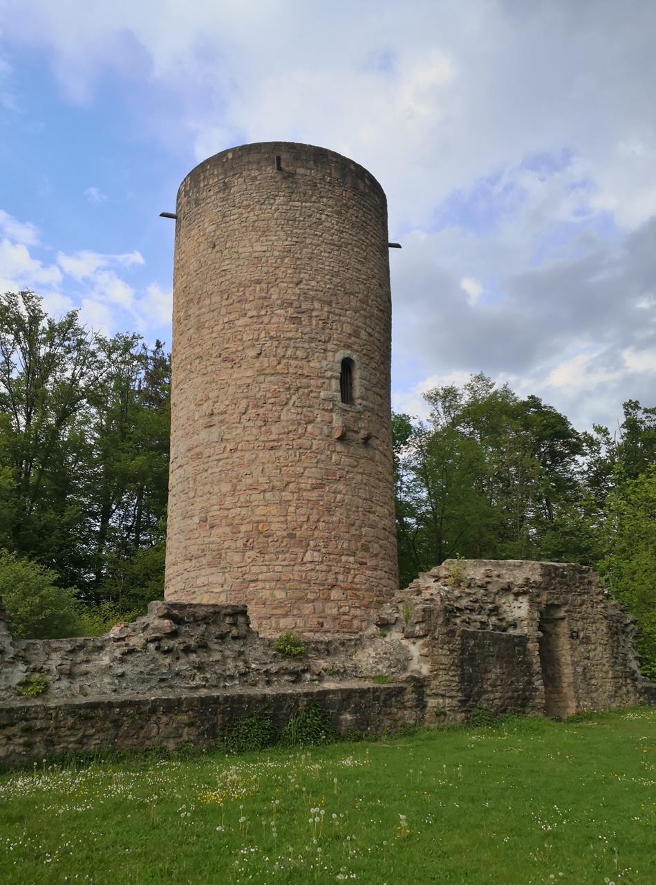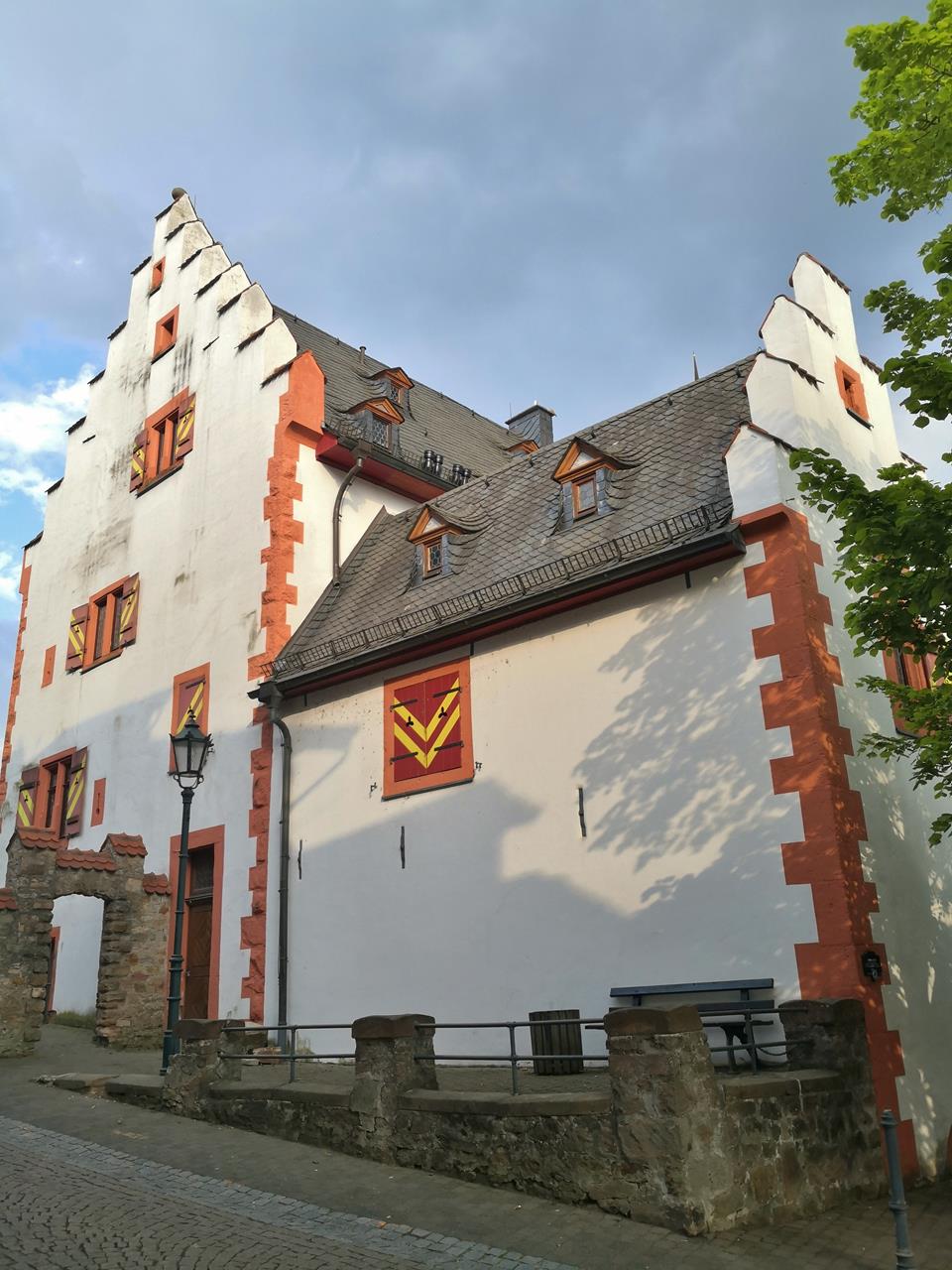 Mit Doxi schaue ich mir insbesondere das historische Zentrum der Stadt zwischen der Salz und dem Stolzenberg an. Am Berg befindet sich das Huttenschloss der früheren Herren von Soden, die neogotische Kirche St. Laurentius von 1896, und ganz oben die Ruine der Burg Stolzenberg mit begehbarem Bergfried. Von dort oben hat man einen tollen Blick auf Bad Soden und weiter über das Tal der Salz bis nach Salmünster.