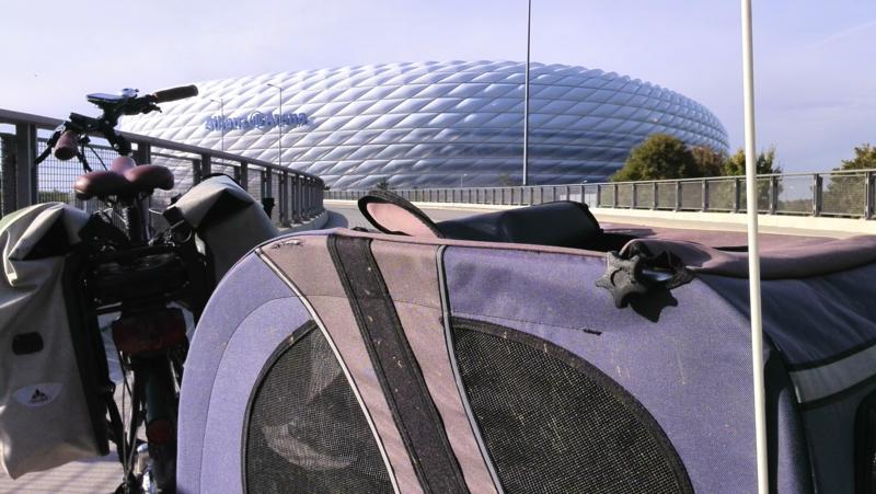 Doxi im Fahrradanhänger vor der Allianz-Arena