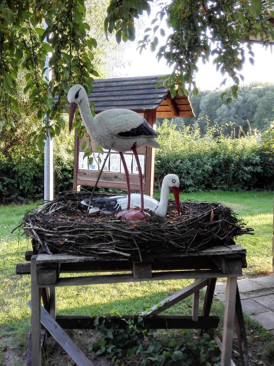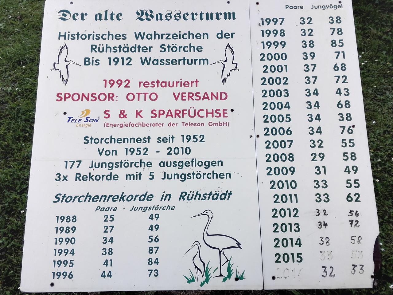 Für jedes Nest wurde eine Informationstafel angebracht, die jährlich Auskunft gibt über das Eintreffen und den Abflug der jeweiligen Störche sowie die Zahl ihres Nachwuchses.