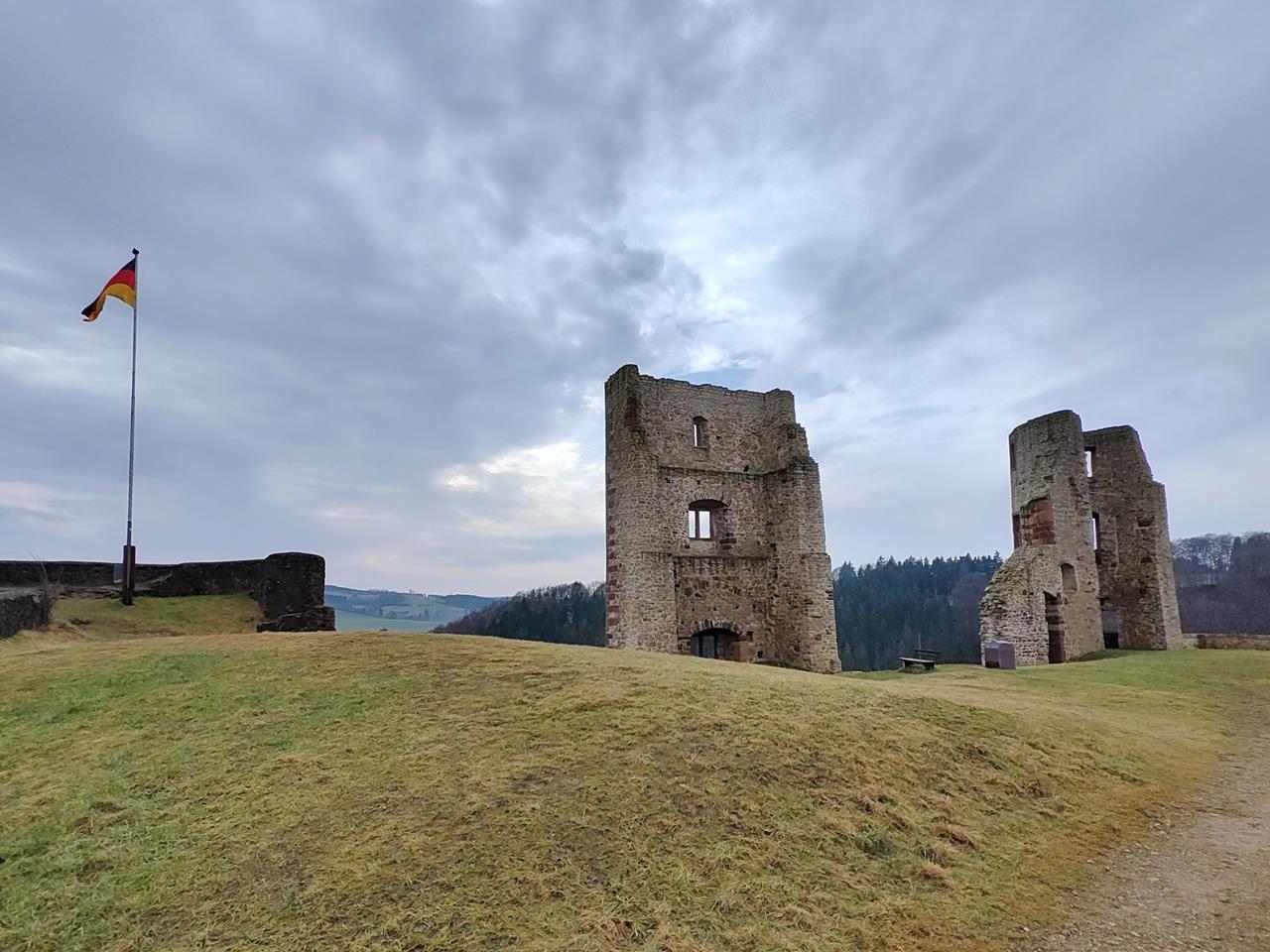 Die 1230 errichtete Burg stand auf dem niedrigsten Bergrücken inmitten eines Talkessels. Die Anlage ist nach allen Seiten von höheren Bergen schützend umgeben. Mit einer Länge von 120 m und einer Breite von 60 war sie eine der größten mittelalterlichen Wehranlagen in der Westeifel.