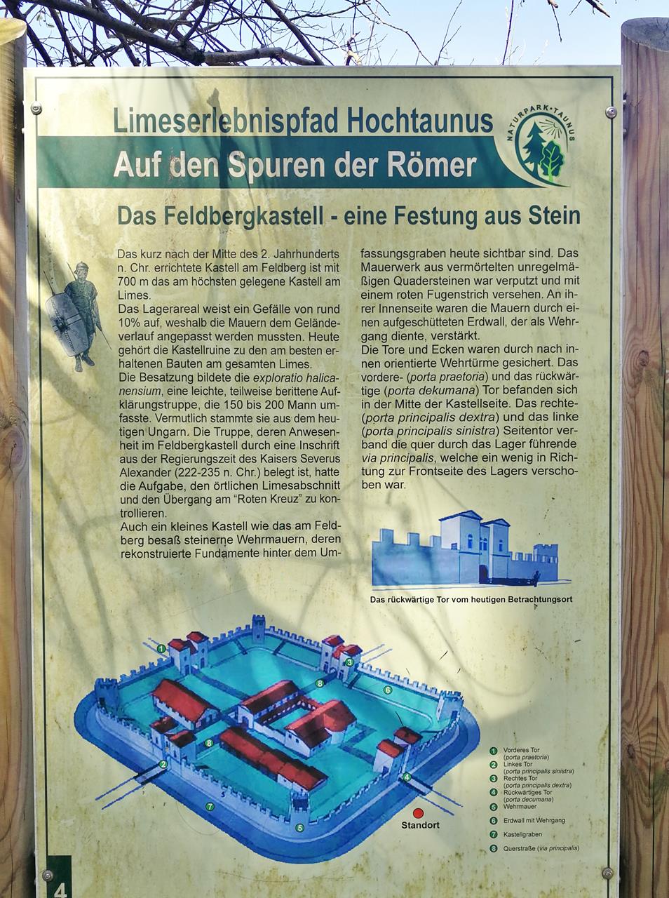 Zurück geht es in einer großen Westschleife an den Ortsteilen Oberreifenberg und Seelenberg vorbei zurück nach Schmitten. Unterhalb des Feldberg-Gipfels kommen wir zunächst an den Ausgrabungsresten eines früheren römischen Kastells vorbei, das Teil der Limes-Grenzsicherung war. Es wurde bewusst in unmittelbarer Nähe zur Quelle der Weil errichtet, damit den Soldaten und Bewohnern immer ausreichend Frischwasser zur Verfügung stand.