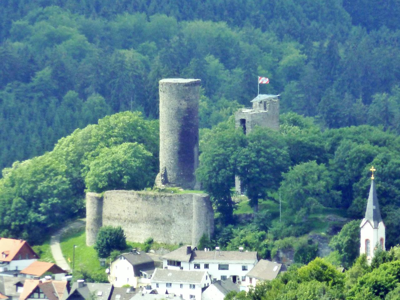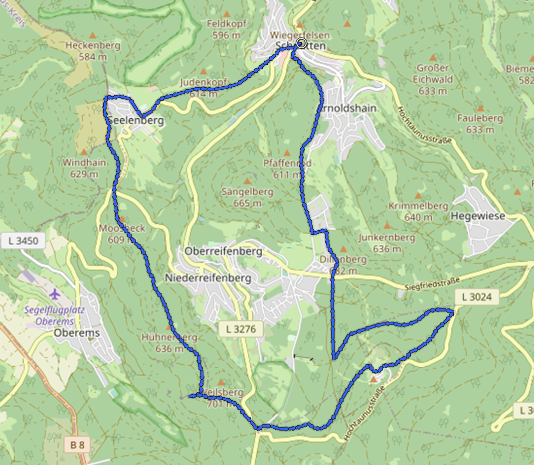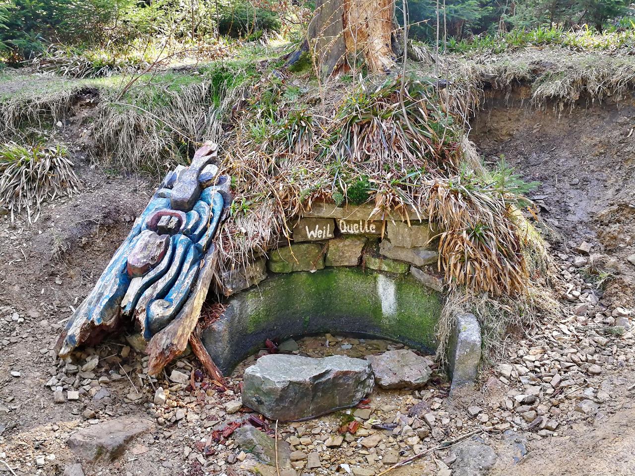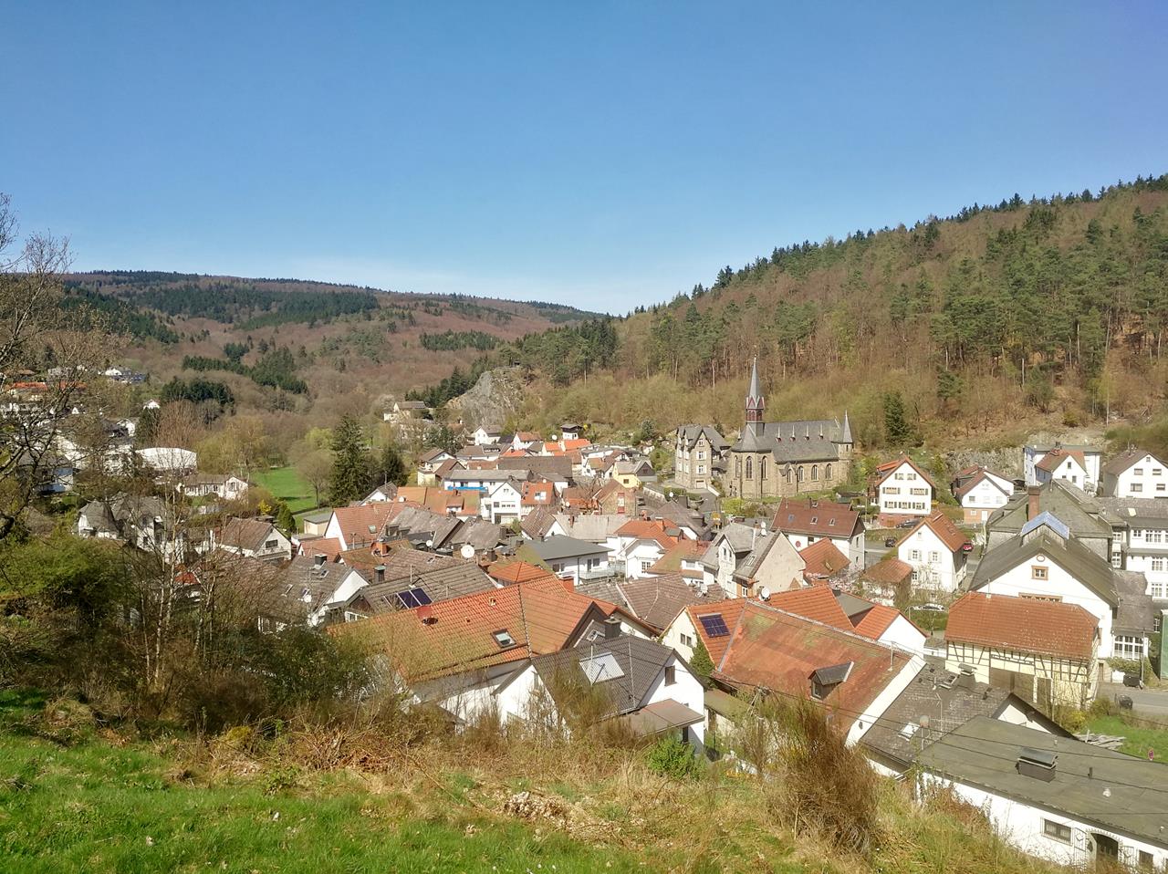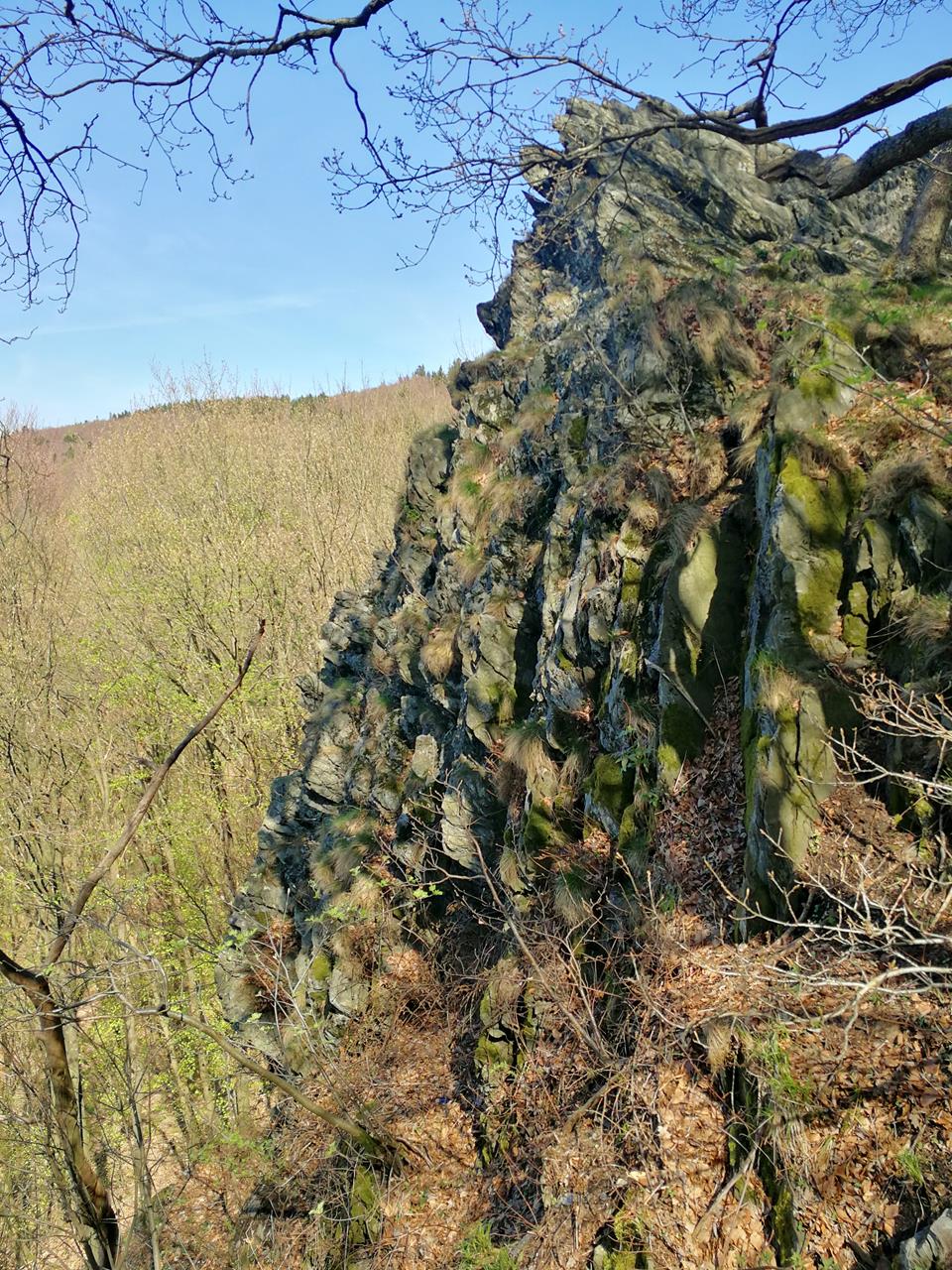 Auf halber Strecke des Rückwegs legen wir einen kurzen Abstecher zum „Großen Zacken“ ein, einem natürlich gewachsenen Felsen, der sich steil über dem Emsbachtal erhebt und einen tollen Fernblick bietet.