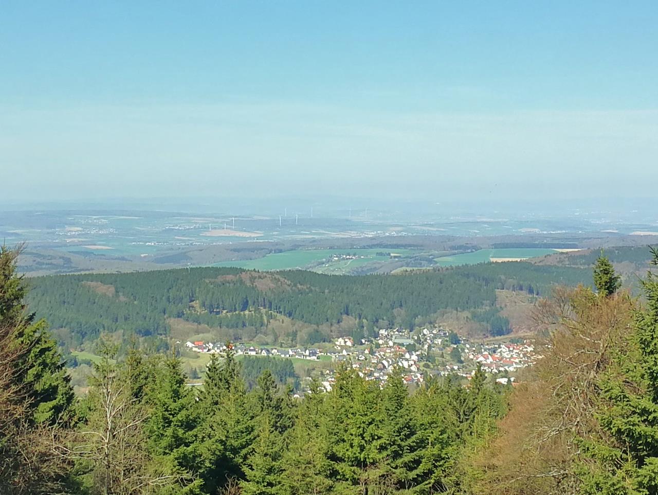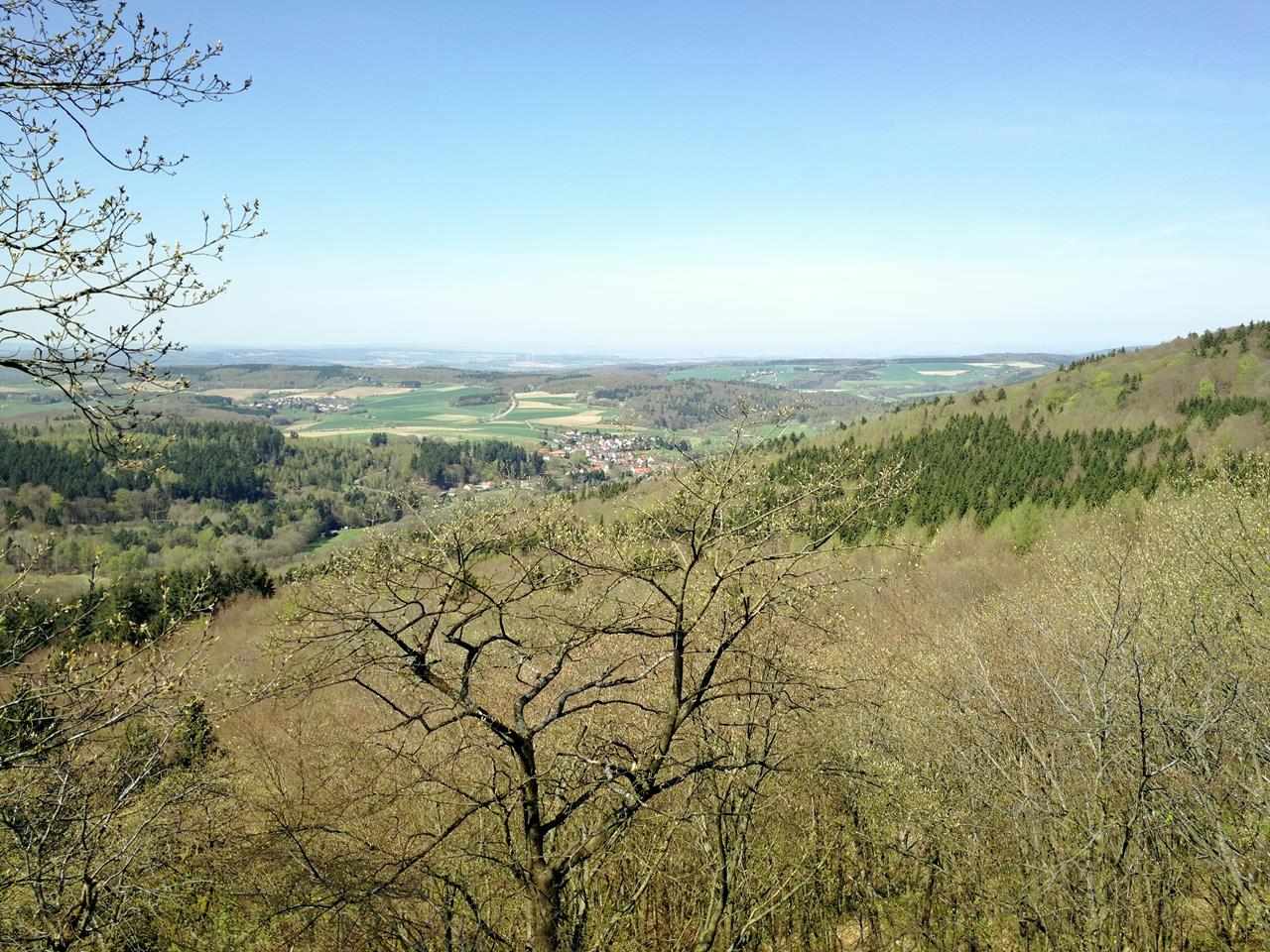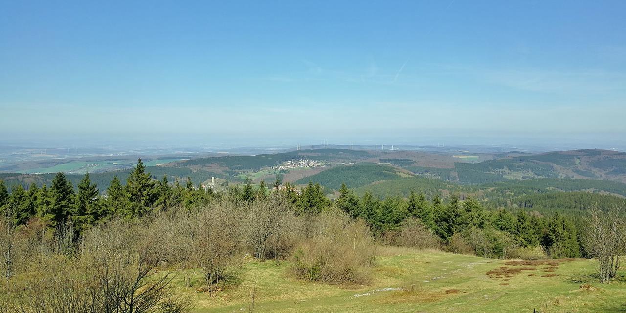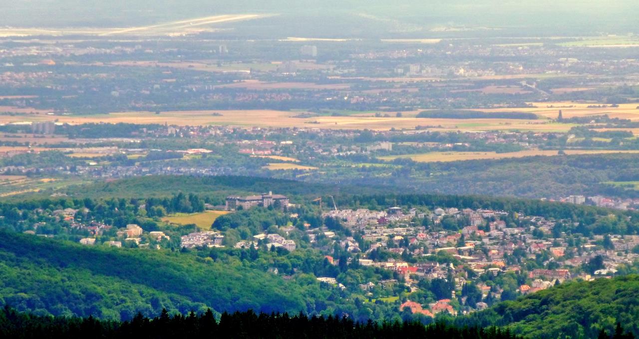 Hier endlich lichtet sich der Wald, sodass man einen herrlichen Panoramablick in Richtung des nördlich gelegenen Hochtaunus hat. Auf der anderen Gipfelseite geht der Blick hinunter in das 30 Kilometer entfernte Frankfurt, dessen Skyline auch im Gegenlicht der starken Sonne gut zu erkennen ist.